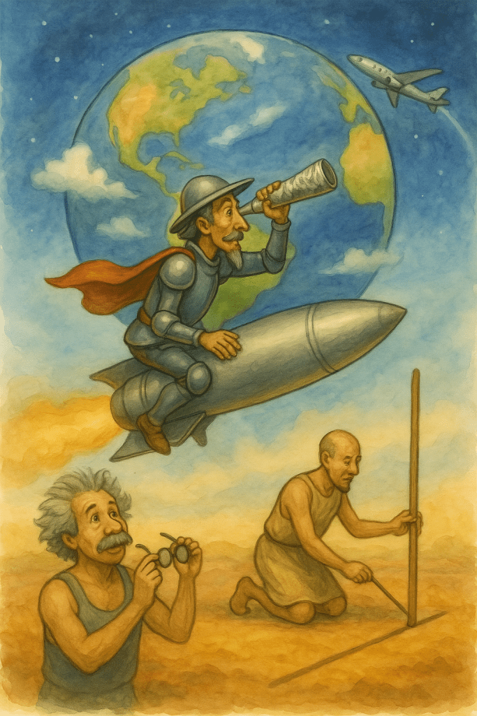 Imaginemos Dom Quixote outra vez em marcha, montado não sobre Rocinante, mas sobre um foguete, mirando o horizonte com sua luneta de papel alumínio. A cada passo ele esbarra em novos moinhos, que hoje tomam a forma de teorias que desafiam não mais a honra, mas a física. Um desses moinhos gira com tamanha força que até desafia a gravidade: a teoria da Terra Plana.